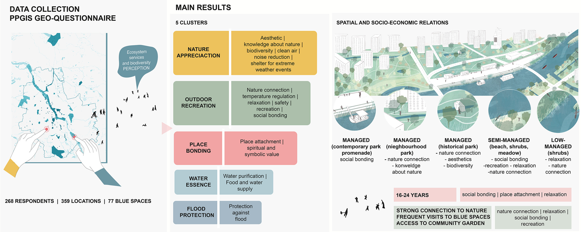 The study examines residents’ perceptions of the benefits (ecosystem services) provided by these spaces. It reveals five distinct clusters of ecosystem services based on their values. The article also shows that while managed parks are heavily valued for social bonding and aesthetics, low- and semi-managed areas play a crucial role in relaxation and nature connection. Therefore, these low-intervention areas have great potential as “Informal Blue Spaces” within the urban infrastructure without high-cost management input. Overall, the results support integrating a diversity of blue spaces into urban planning and policy frameworks.