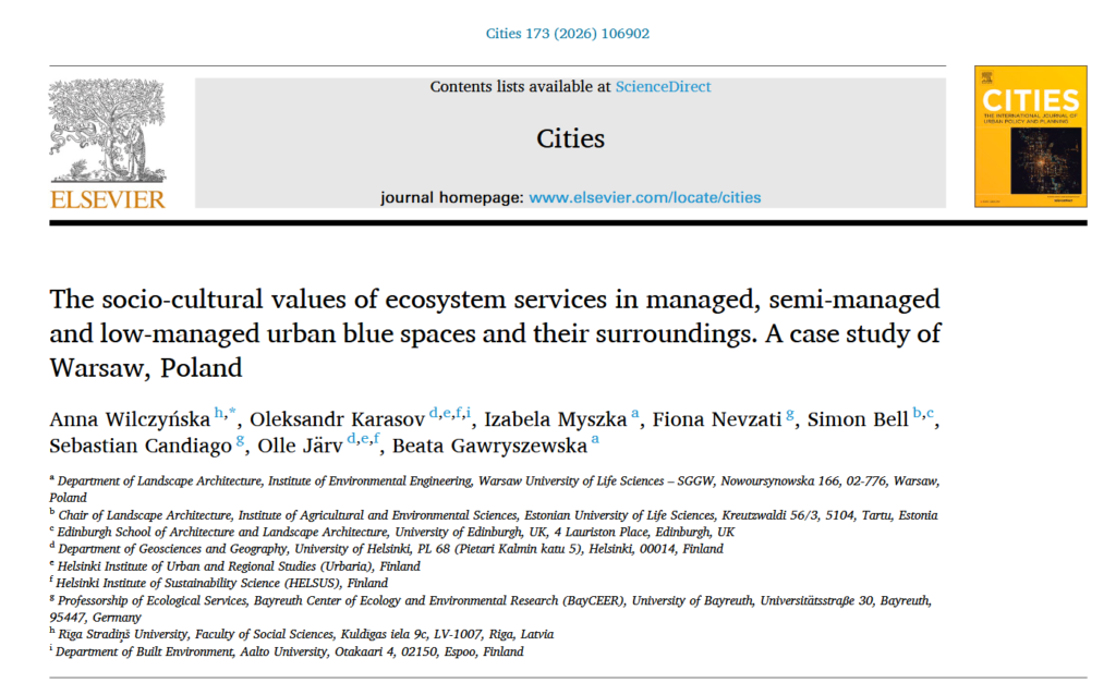 We are happy to share that Oleksandr recently co-authored a paper published in the journal Cities. In this paper, the authors investigated the socio-cultural values of ecosystem services in managed, semi-managed, and low-managed urban blue spaces in Warsaw, Poland, using participatory mapping (PPGIS) data. The work was led by the Anna Wilczyńska from the Rīga Stradiņš University, and done in great collaboration with an international team from the Warsaw University of Life Sciences (Izabela Myszka and Beata Gawryszewska), the University of Bayreuth (Sebastian Candiago, Fiona Nevzati), University of Helsinki (Olle Järv), the Estonian University of Life Sciences and the University of Edinburgh (Simon Bell)!